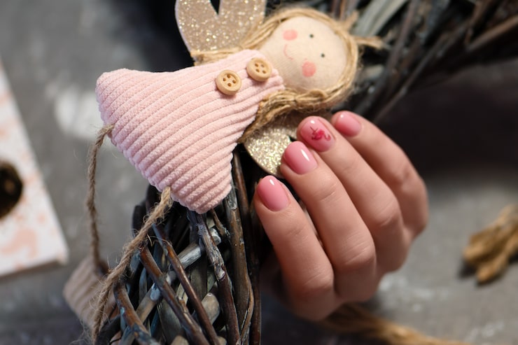 Полосатые красные и белые сахарные палочки – идеальное рождественское лакомство. Поэтому предложите нарисовать этот праздничный символ на ногте безымянного пальца, сделав его акцентным. Остальные ногти покройте нежно-розовым лаком, а кончики оформляйте не белым, а бордовым цветом с серебристыми блёстками.